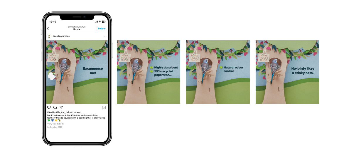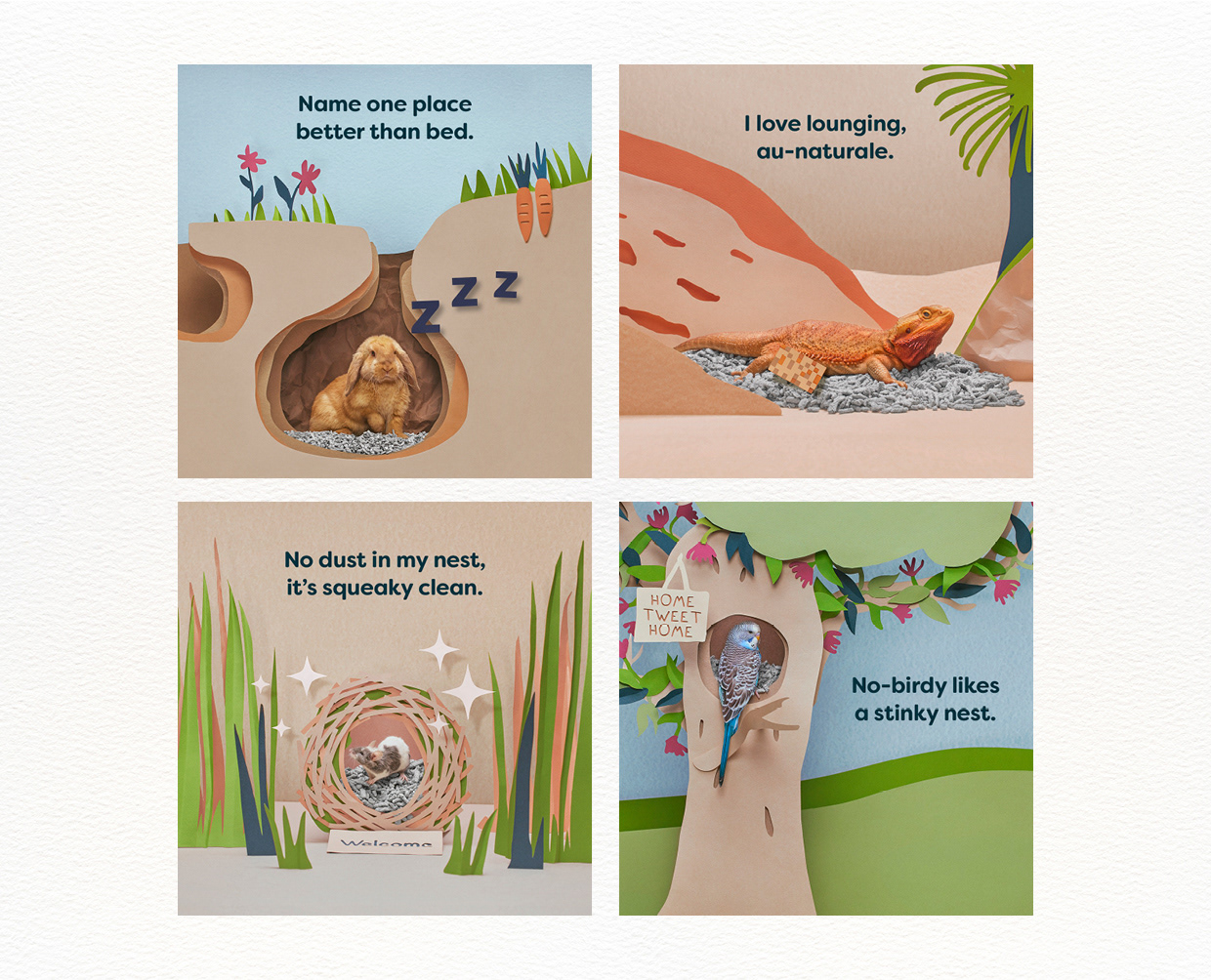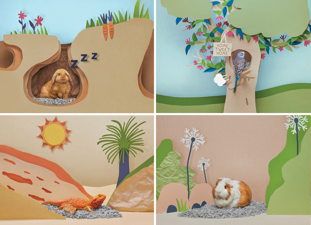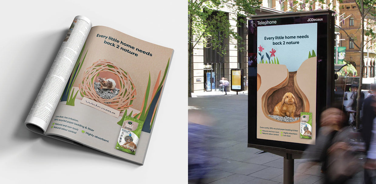 Back 2 Nature small animal bedding and litter is made from 99% recycled paper with no added nasties, it’s great for burrowing, nesting, and smelly business. The idea for the campaign was to show cute animals in their homes which were made entirely out of paper. I helped Creative Director Tina Funder with the visuals for this global campaign, by mocking up the scenes so they could be recreated by a paper artist. I then rolled out the artwork for all the channels. The rollout included some videos, digital OOHs, digital banners, eDMs and social media posts.